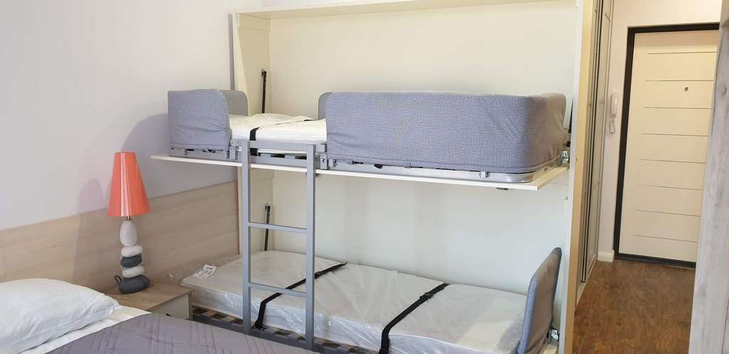 Для размещения 2 места – двуспальная кровать, с возможностью разделения, плюс 2 места - двухъярусная кровать-трансформер (2 полноценных спальных места, для детей или гостей) , всего 4 места.
