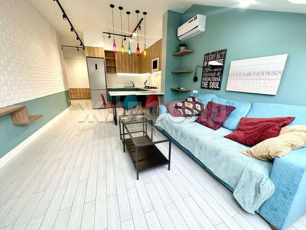 Жилая площадь 40 м2, кухня 25 кв. м, внутри евро ремонт, комнаты изолированные, есть интернет и домашний телефон, совмещенных санузлов - 1, окна выходят во двор.