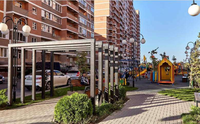 Во дворе детские площадки и место для отдыха с фонтаном.