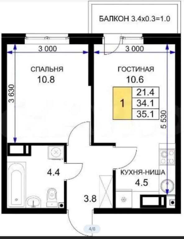 Продажа 1-комнатной квартиры, Краснодар, им. Героя Ростовского ул., Д.8 к.6, Краснодарский край