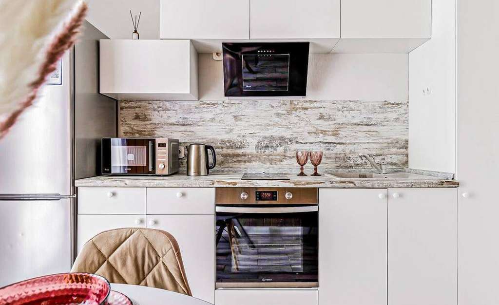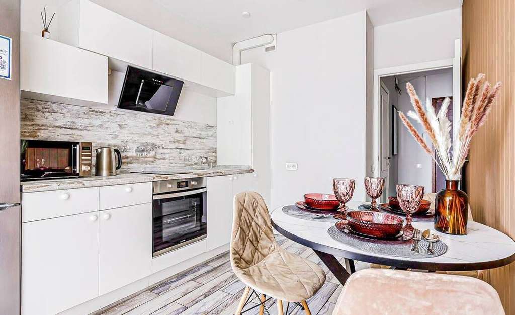 Укомплектованная техникой и посудой кухонная зона