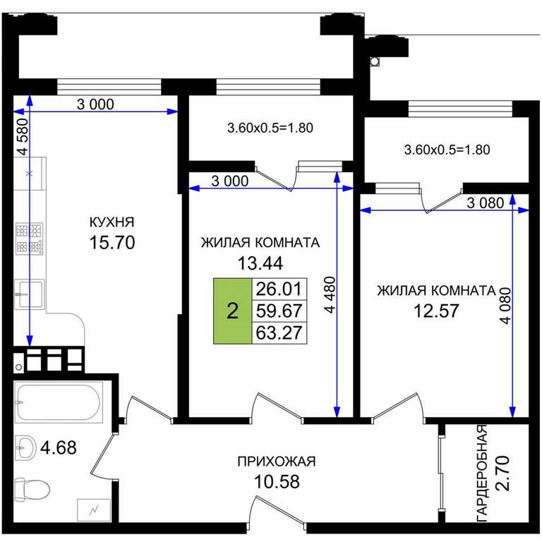 Жилая площадь 26.01 м2, кухня 15.7 м2, предчистовая отделка.