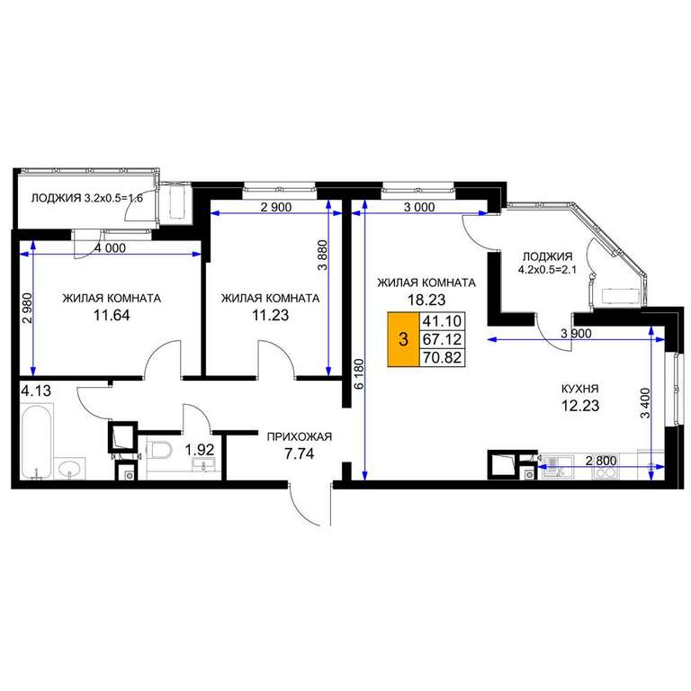 Жилая площадь 41.1 м2, кухня 12.23 м2, предчистовая отделка.