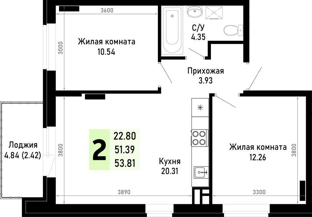 Жилая площадь 22.8 м2, кухня 20.31 м2, предчистовая отделка.