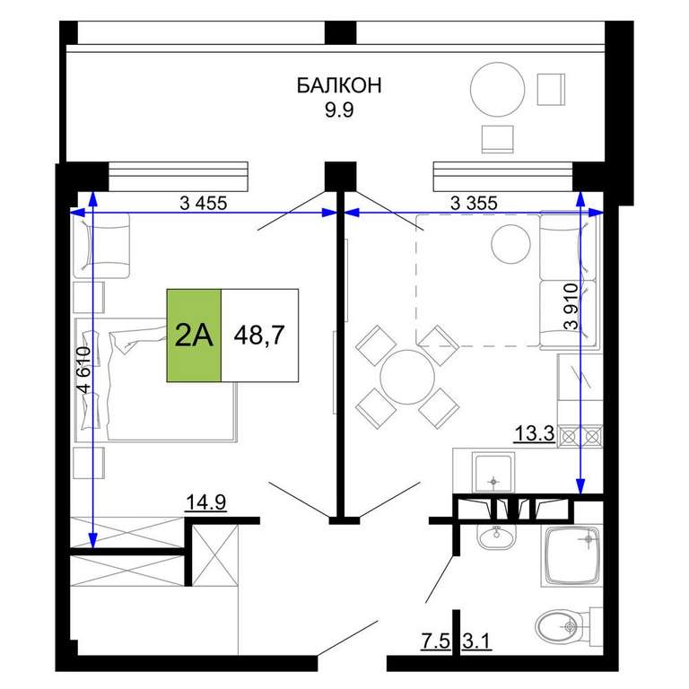 Жилая площадь 14.9 м2, кухня 13.3 м2, чистовая отделка с мебелью.