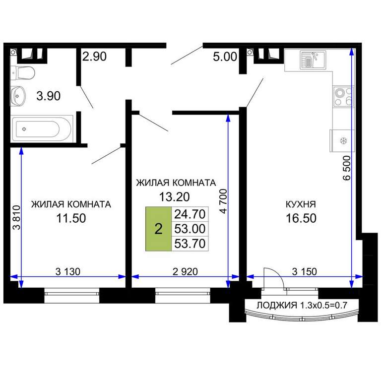 Жилая площадь 24.7 м2, кухня 16.5 м2, предчистовая отделка.