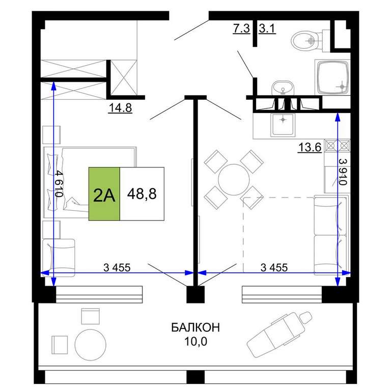 Жилая площадь 14.8 м2, кухня 13.6 м2, чистовая отделка с мебелью.