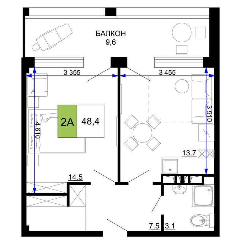 Жилая площадь 14.5 м2, кухня 13.7 м2, чистовая отделка с мебелью.