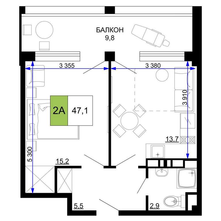 Жилая площадь 15.2 м2, кухня 13.7 м2, чистовая отделка с мебелью.