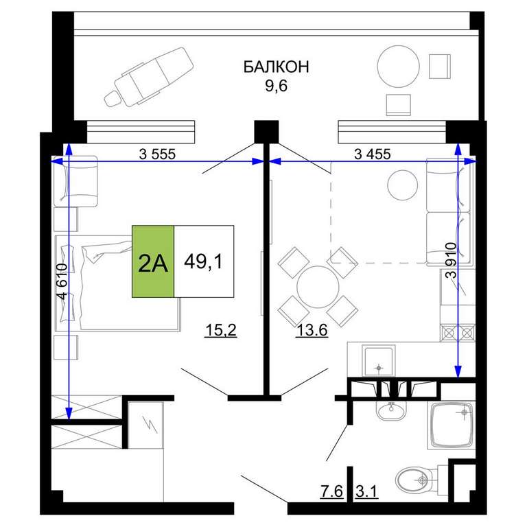 Жилая площадь 15.2 м2, кухня 13.6 м2, чистовая отделка с мебелью.