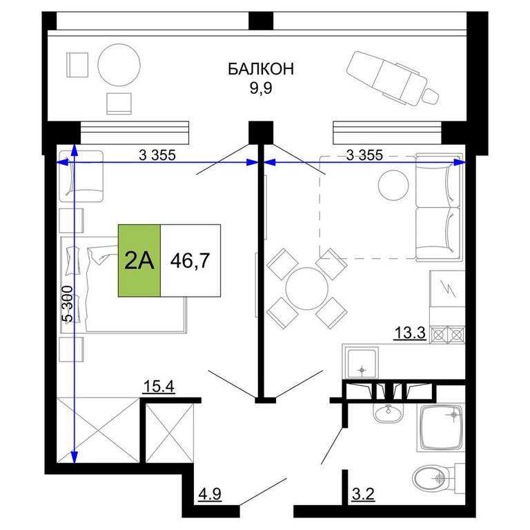 Жилая площадь 15.4 м2, кухня 13.3 м2, чистовая отделка с мебелью.