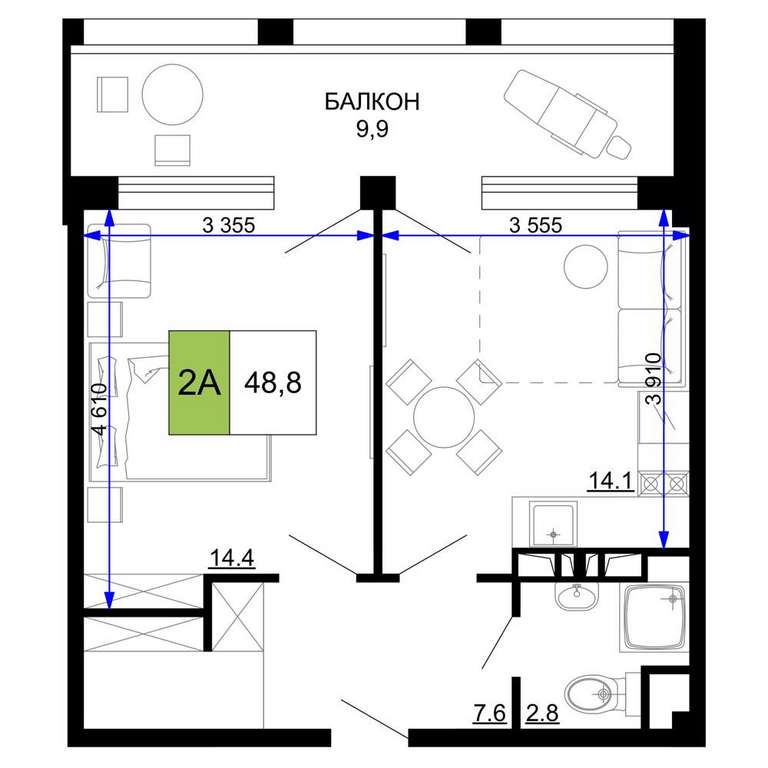 Жилая площадь 14.4 м2, кухня 14.1 м2, чистовая отделка с мебелью.
