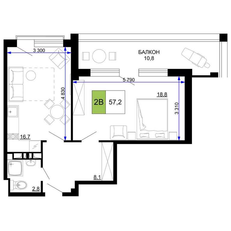 Жилая площадь 18.8 м2, кухня 16.7 м2, чистовая отделка с мебелью.