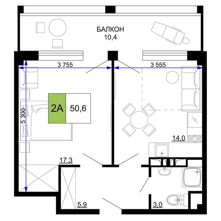 Жилая площадь 17.3 м2, кухня 14 м2, чистовая отделка с мебелью.