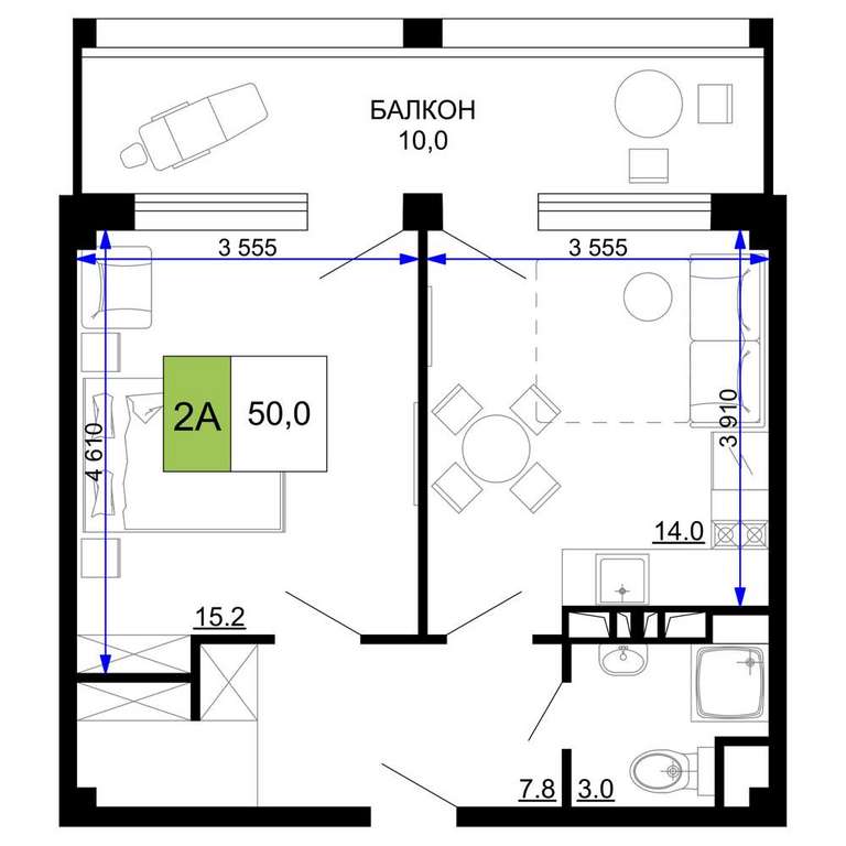 Жилая площадь 15.2 м2, кухня 14 м2, чистовая отделка с мебелью.