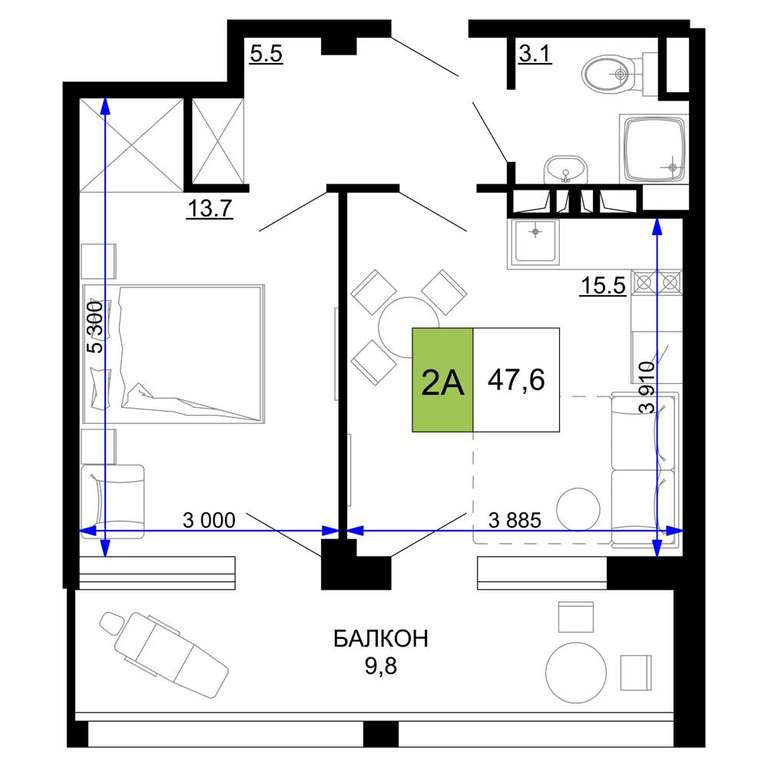 Жилая площадь 13.7 м2, кухня 15.5 м2, чистовая отделка с мебелью.
