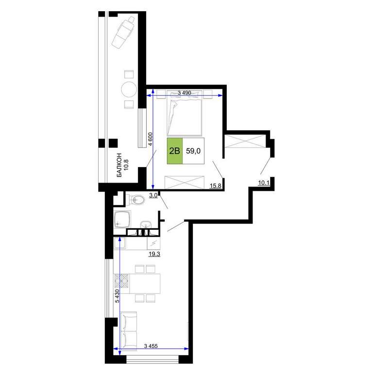 Жилая площадь 15.8 м2, кухня 19.3 м2, чистовая отделка с мебелью.