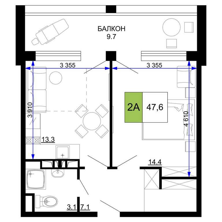 Жилая площадь 14.4 м2, кухня 13.3 м2, чистовая отделка с мебелью.