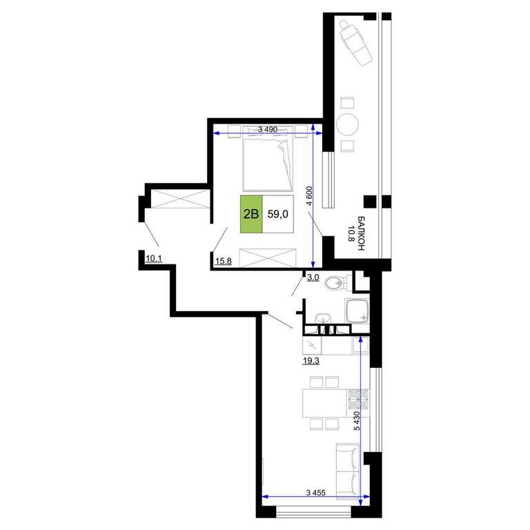 Жилая площадь 15.8 м2, кухня 19.3 м2, чистовая отделка с мебелью.