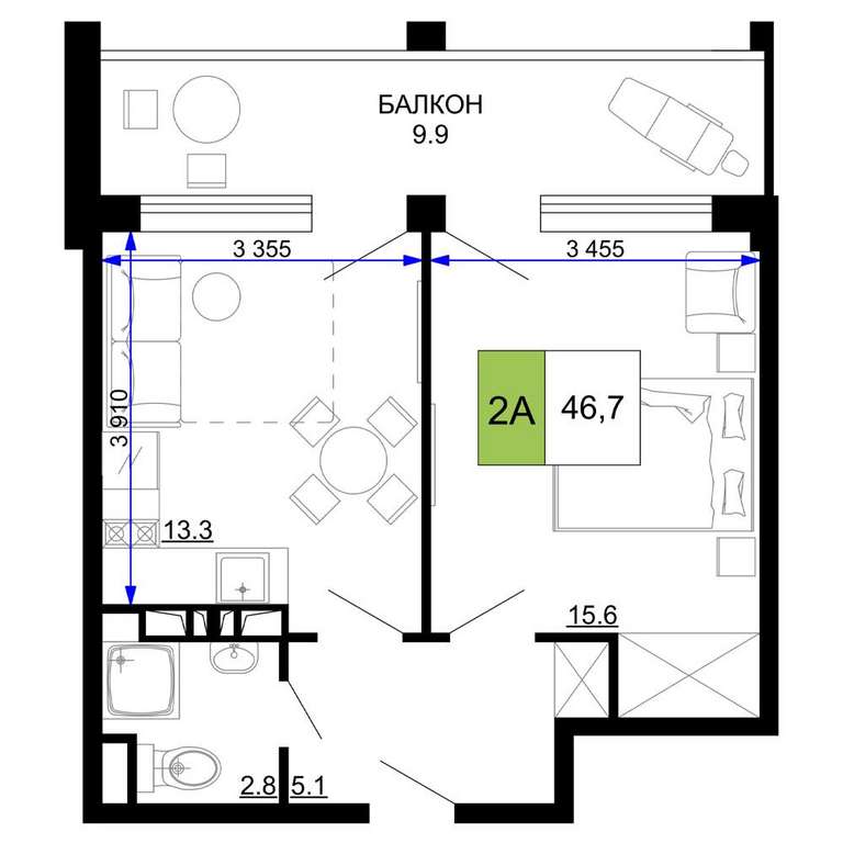 Жилая площадь 15.6 м2, кухня 13.3 м2, чистовая отделка с мебелью.