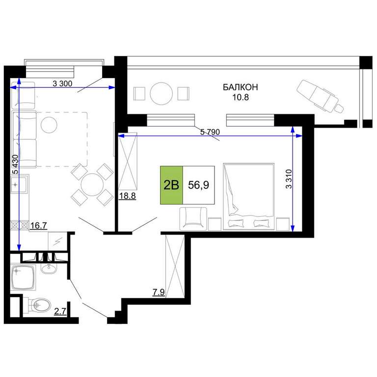 - 56.90 м2