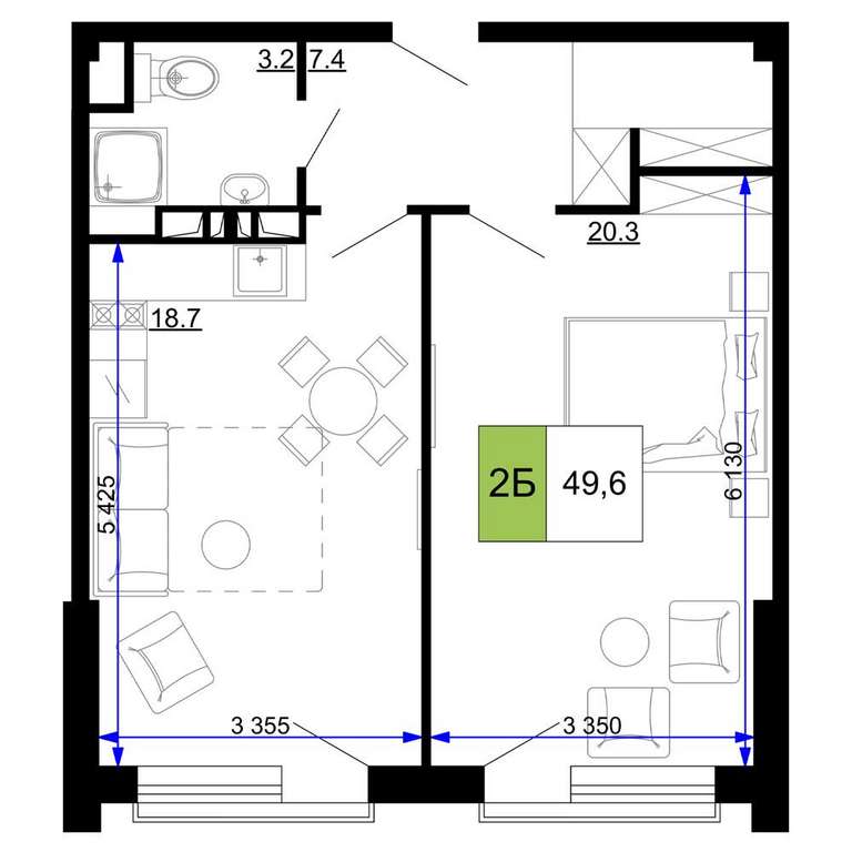 Жилая площадь 20.3 м2, кухня 18.7 м2, чистовая отделка с мебелью.