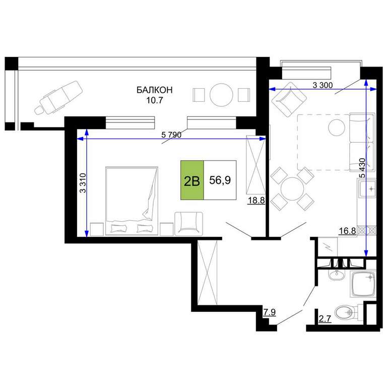 - 56.90 м2