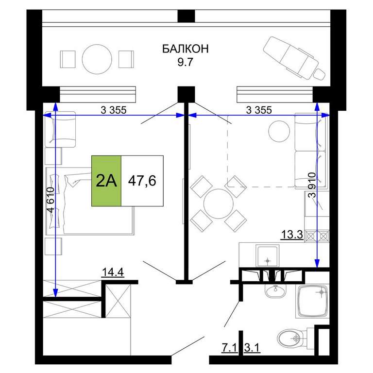 Жилая площадь 14.4 м2, кухня 13.3 м2, чистовая отделка с мебелью.