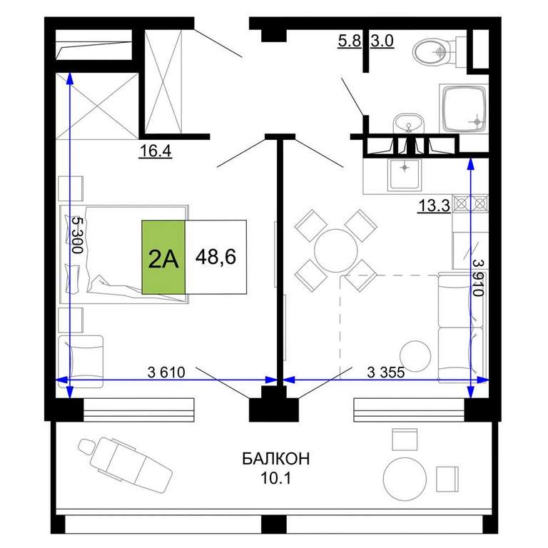 Жилая площадь 16.4 м2, кухня 13.3 м2, чистовая отделка с мебелью.