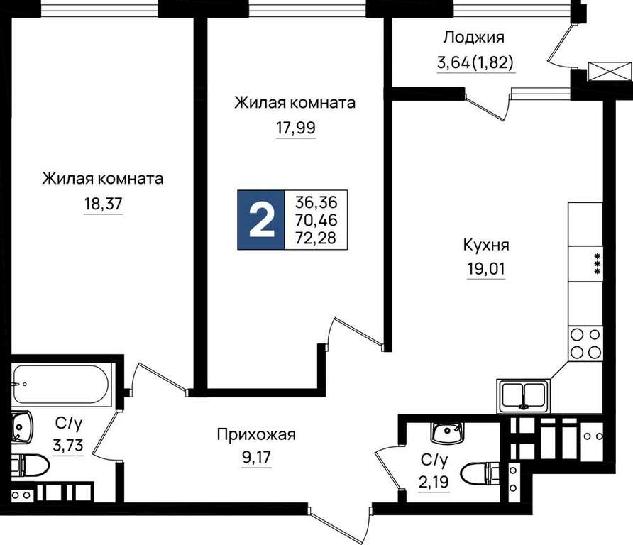 Жилая площадь 36.36 м2, кухня 19.01 м2, предчистовая отделка.