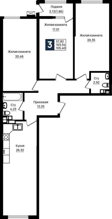 Жилая площадь 57.82 м2, кухня 26.32 м2, предчистовая отделка.