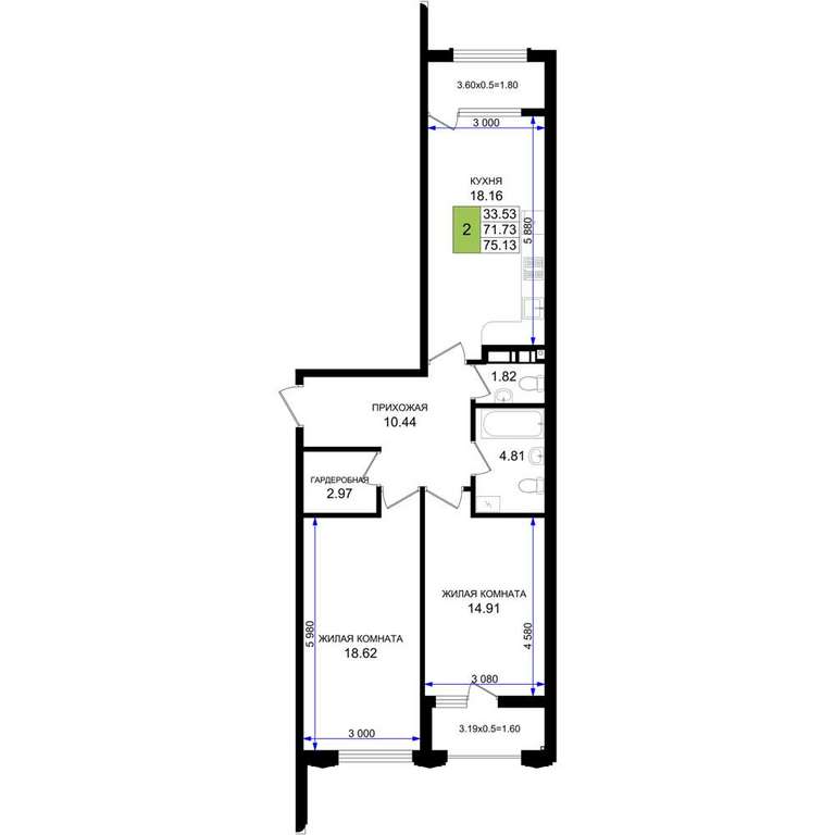Жилая площадь 33.53 м2, кухня 18.16 м2, предчистовая отделка.