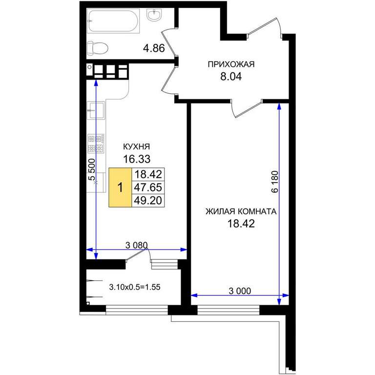 Жилая площадь 18.42 м2, кухня 16.33 м2, предчистовая отделка, комнаты изолированные.