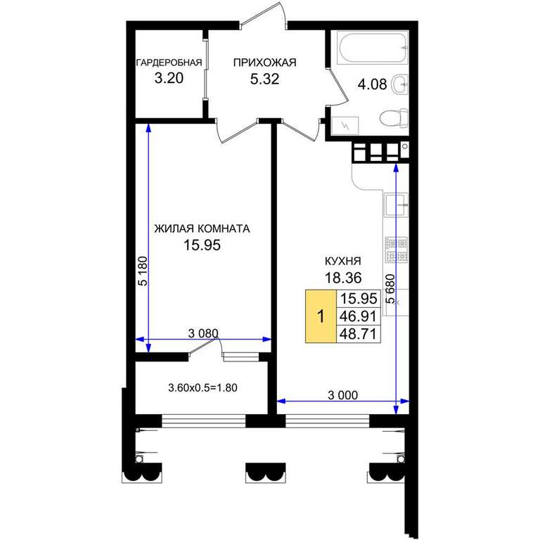Жилая площадь 15.95 м2, кухня 18.36 м2, предчистовая отделка, комнаты изолированные.