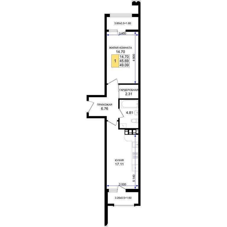 Жилая площадь 14.7 м2, кухня 17.11 м2, предчистовая отделка, комнаты изолированные.