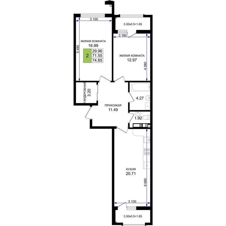 Жилая площадь 29.96 м2, кухня 20.71 м2, предчистовая отделка.