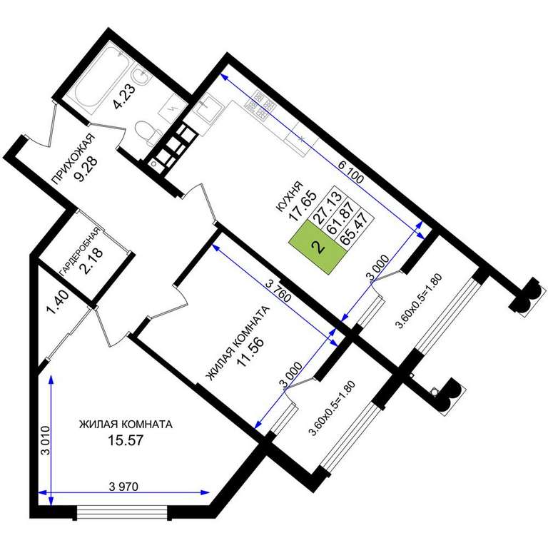 Жилая площадь 27.13 м2, кухня 17.65 м2, предчистовая отделка.