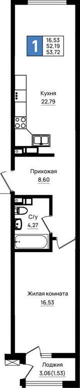 Жилая площадь 16.53 м2, кухня 22.79 м2, предчистовая отделка, комнаты изолированные.
