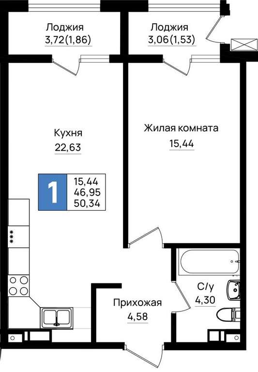 Жилая площадь 15.44 м2, кухня 22.63 м2, предчистовая отделка, комнаты изолированные.