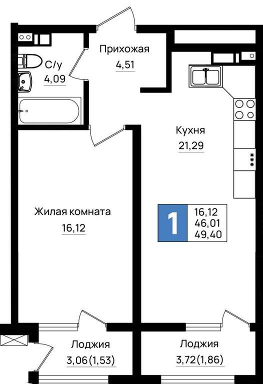 Жилая площадь 16.12 м2, кухня 21.29 м2, предчистовая отделка, комнаты изолированные.