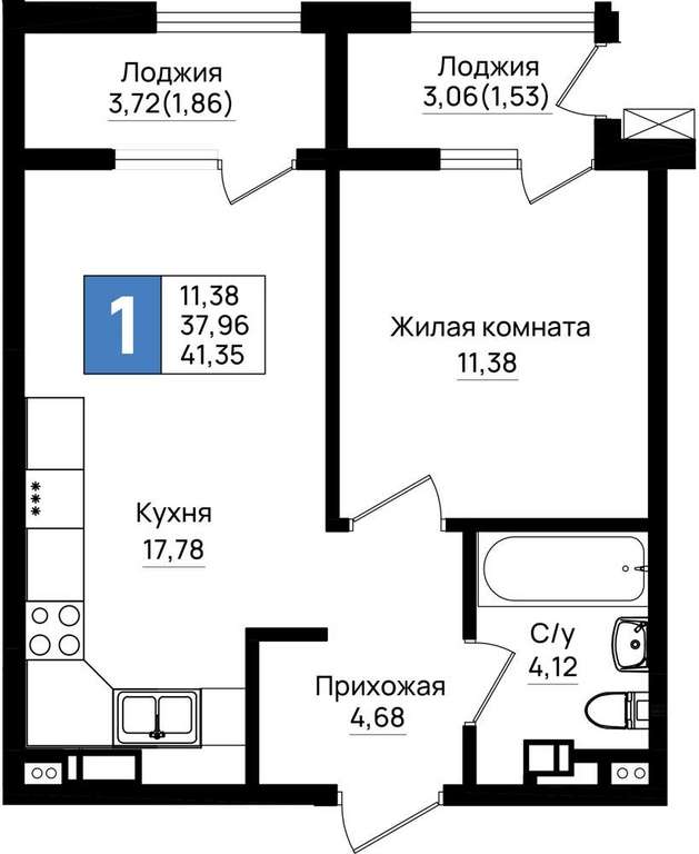 Жилая площадь 11.38 м2, кухня 17.78 м2, предчистовая отделка, комнаты изолированные.