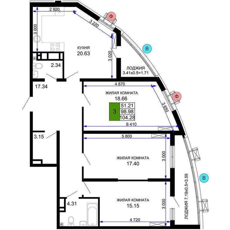 Жилая площадь 51.21 м2, кухня 20.63 м2, предчистовая отделка.