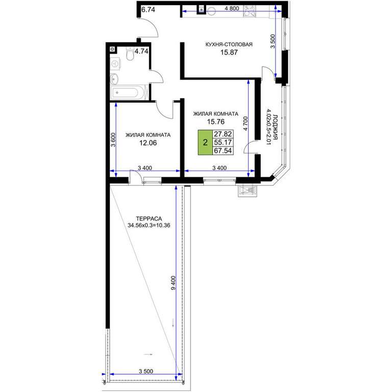 Жилая площадь 27.82 м2, кухня 15.87 м2, предчистовая отделка.