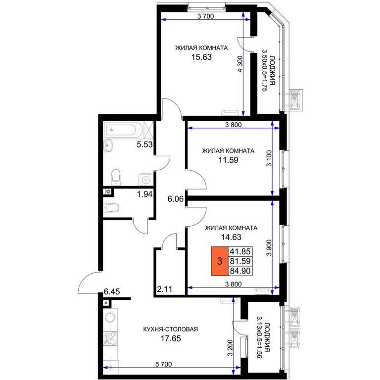 Жилая площадь 41.85 м2, кухня 17.65 м2, предчистовая отделка.