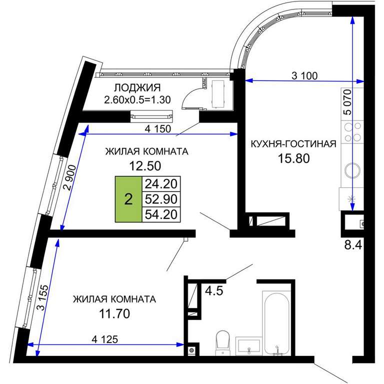 Жилая площадь 24.2 м2, кухня 15.8 м2, предчистовая отделка.