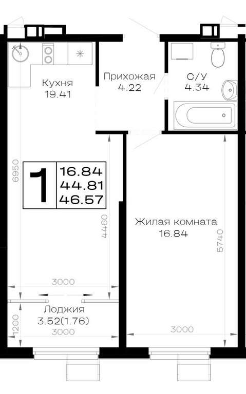 Жилая площадь 16.84 м2, кухня 19.41 м2, предчистовая отделка, комнаты изолированные.