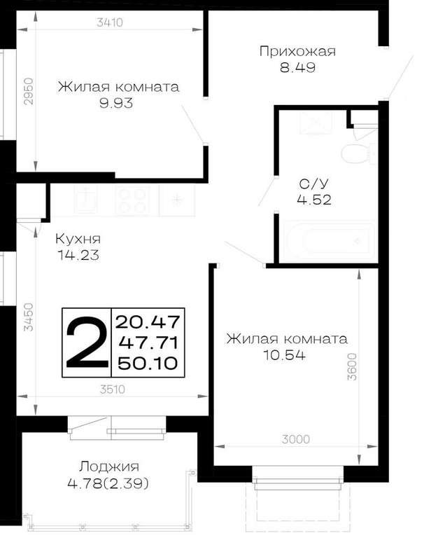 Жилая площадь 20.47 м2, кухня 14.23 м2, предчистовая отделка.