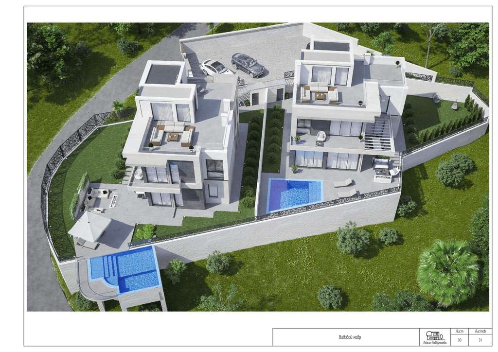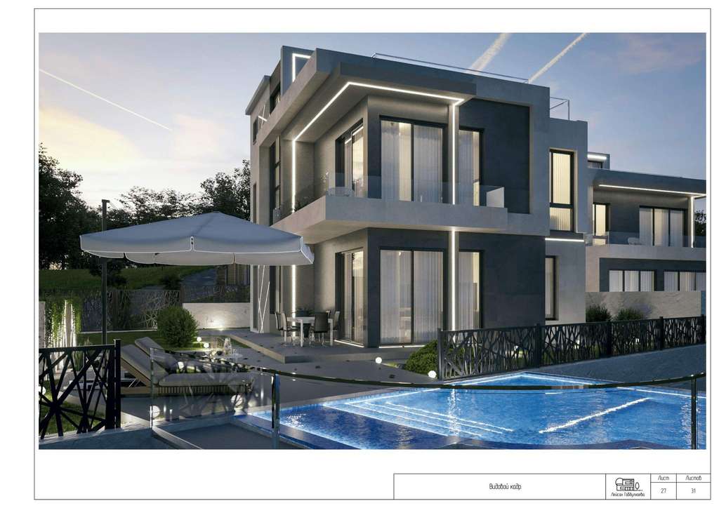 Теперь о самом доме - отдельный въезд, парковочная зона и личный бассейн. Все необходимые коммуникации уже подведены: электричество, водопровод, газ и септик. Также участки находятся под охраной.