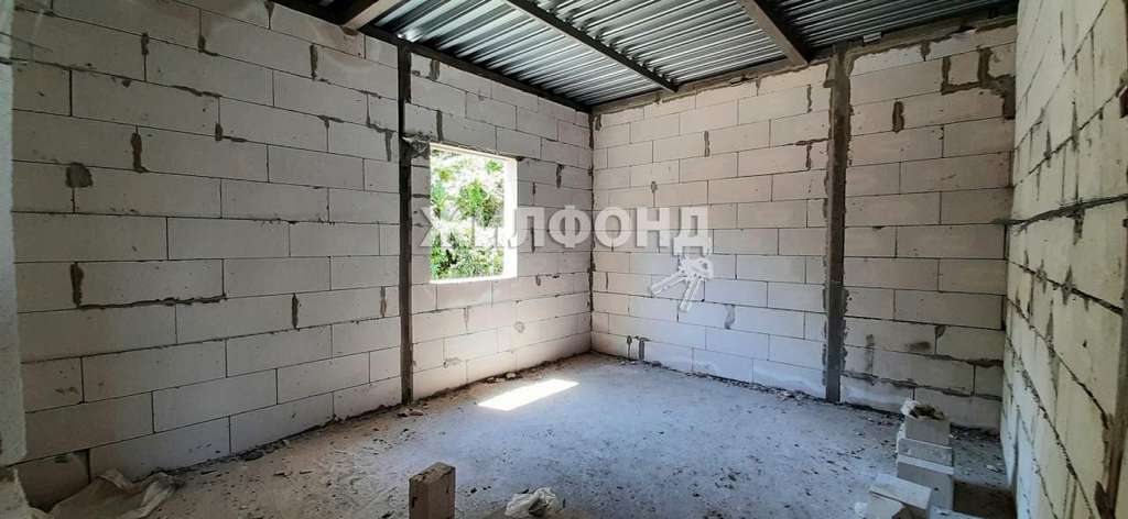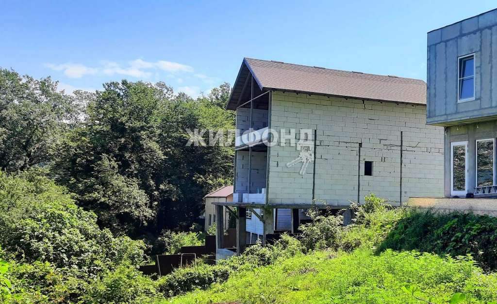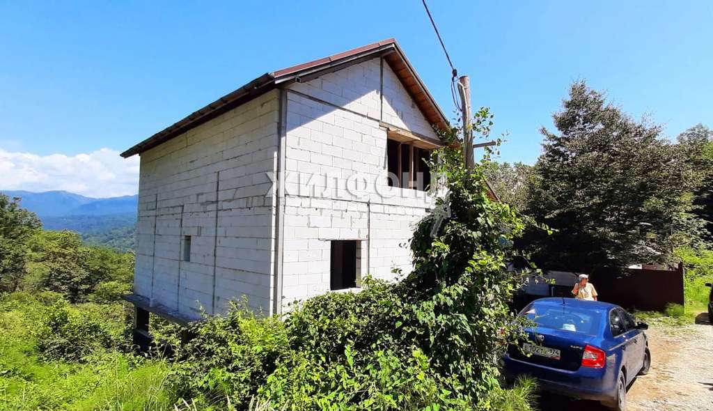 Дом представляет собой незавершенное строительство. Девять свай держат монолитный каркас. Стены выложены газобетонными блоками. Двускатная кровля формирует просторный мансардный этаж, в котором спокойно разместятся не менее трех комнат. На первом этаже спланированы 4 комнаты с двумя балконами. Большой цокольный этаж площадью 100 кв. м и высотой потолков 2,75 м можно использовать как под жилые помещения, так и под хозблок или сауну. На всех этажах сделаны проемы под панорамные окна из которых открываются прекрасные виды на горы.
