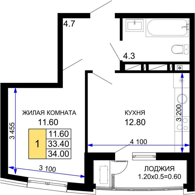 Жилая площадь 11.6 м2, кухня 12.8 м2, предчистовая отделка, комнаты изолированные.